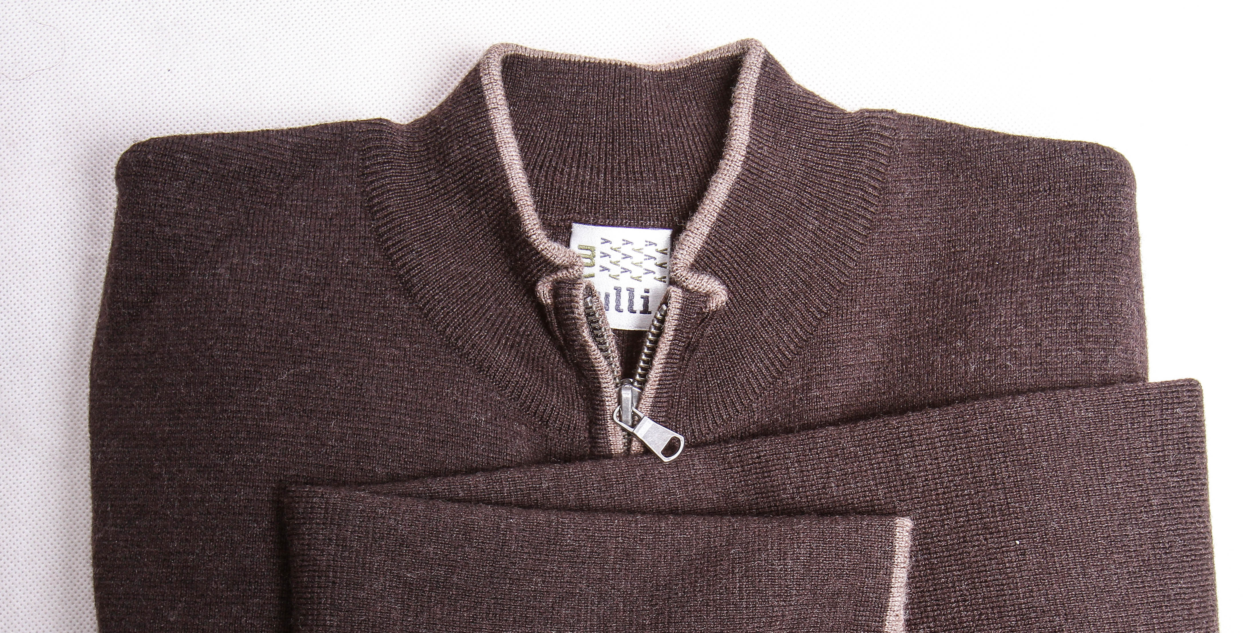 Dunkelbraune Strickjacke aus 100 % Merinowolle mit 2 Wegereißverschluss und nougatfarbenen Kontraststreifen